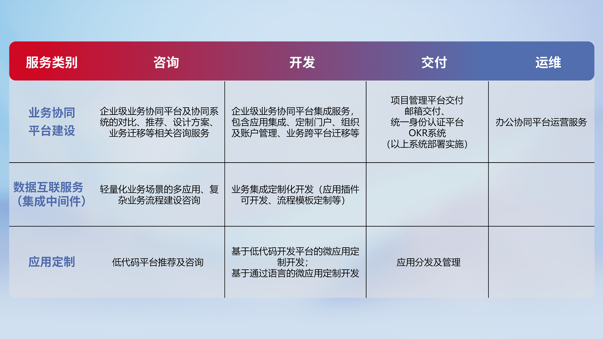 针对钉钉、、、企微、、、IDaas等平台级产品提供产品的规划、、、方案、、、、交付、、定制化开发等服务,,实现如统一协同办公、、、智能客户服务、、、混合会议管理、、、智能数据查询、、等业务场景,,,,实现数字化转型。。。